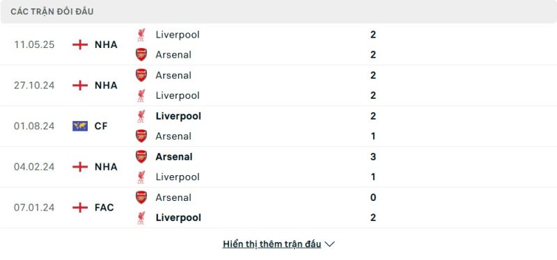 Thành tích đối đầu của Liverpool vs Arsenal
