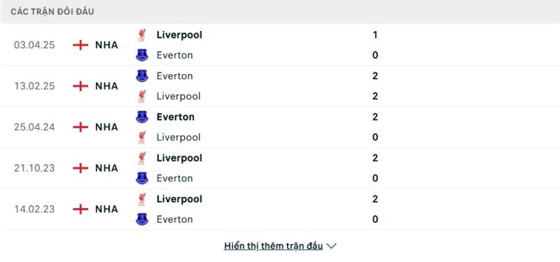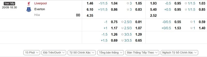 Bảng Tỷ lệ kèo bóng đá Liverpool vs Everton