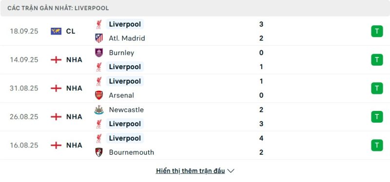 5 trận gần nhất của Liverpool: W-W-W-W-W