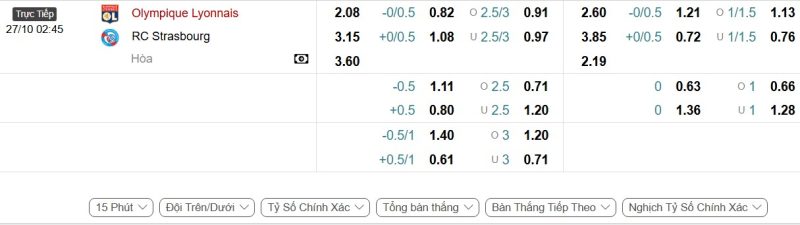 Bảng Tỷ lệ kèo bóng đá Lyon vs Strasbourg