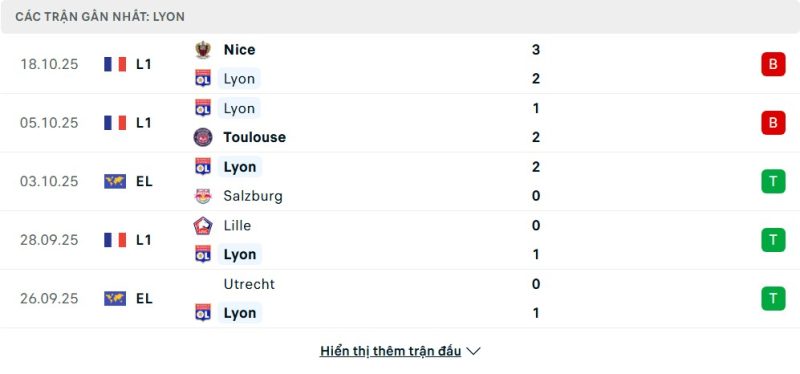 5 trận gần nhất của Lyon: L-L-W-W-W