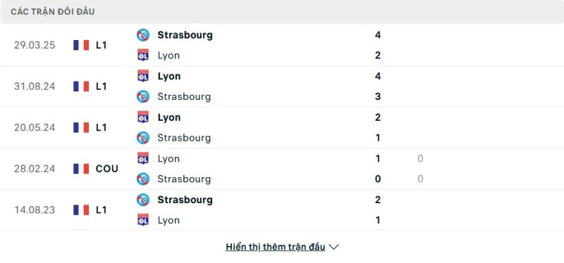 Thành tích đối đầu của Lyon vs Strasbourg