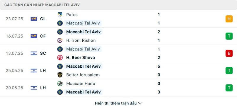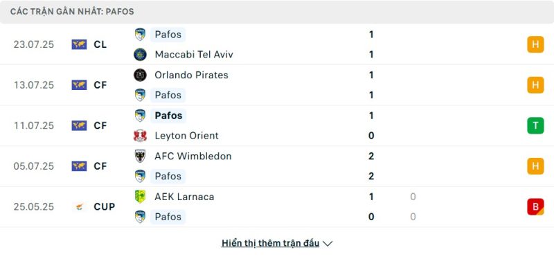 Thống kê phong độ gần đây Maccabi Tel Aviv vs Pafos FC