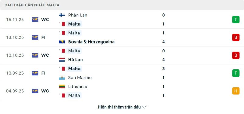 5 trận gần nhất của Malta: W-L-L-W-D