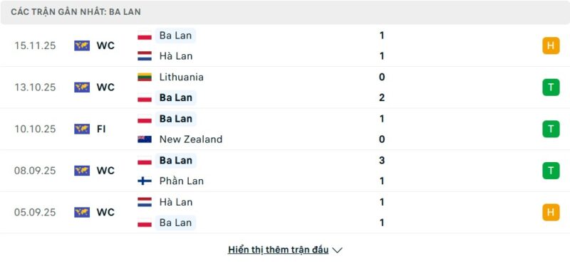 5 trận gần nhất của Ba Lan: D-W-W-W-D