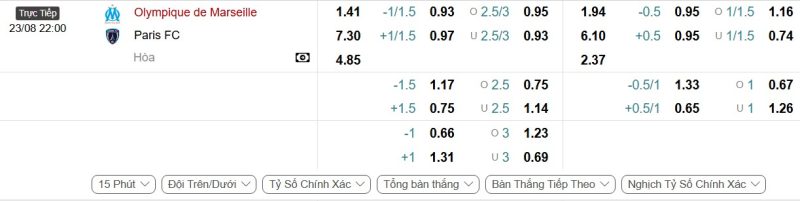 Bảng Tỷ lệ kèo bóng đá Marseille vs Paris FC