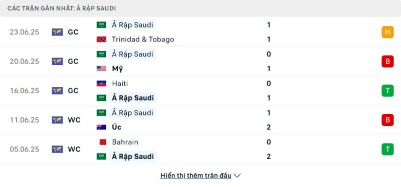 5 trận gần nhất của Ả Rập Xê Út: D-L-W-L-W