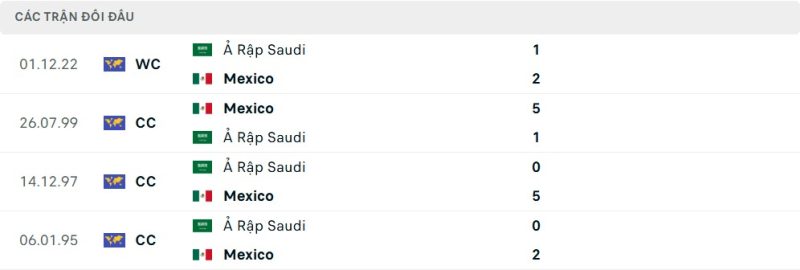 Thành tích đối đầu của Mexico vs Ả Rập Xê Út