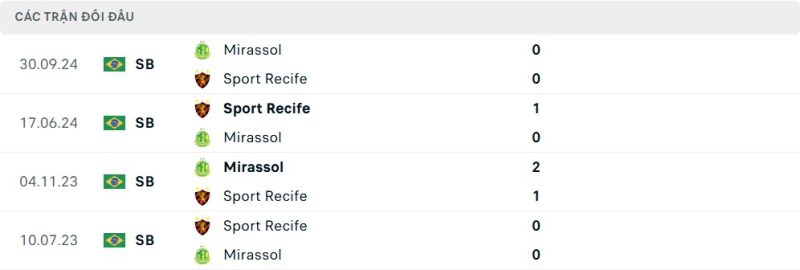 Thành tích đối đầu của Mirassol vs Sport Recife