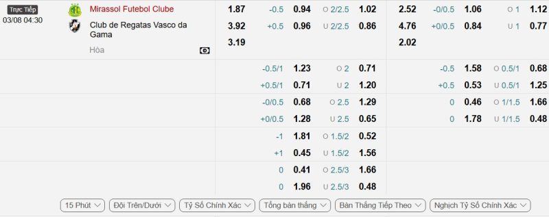 Bảng Tỷ lệ kèo bóng đá Mirassol vs Vasco da Gama