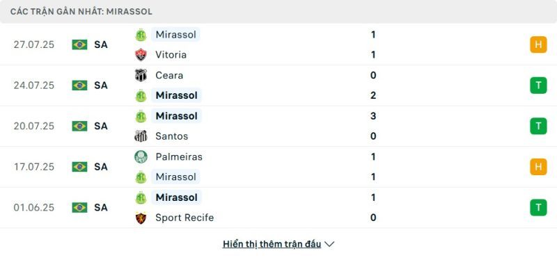 Mirassol đang có phong độ khá ổn định trong thời gian gần đây. Hiện tại, họ đứng ở vị trí thứ 7 trên bảng xếp hạng với 25 điểm sau 16 trận đấu. Phong độ của họ trong 5 trận gần nhất trên mọi đấu trường là khá ấn tượng với 3 chiến thắng và 2 trận hòa. Đáng chú ý, họ đã cầm hòa được Vitoria và Ceara, cũng như giành chiến thắng thuyết phục trước Santos. Những kết quả này cho thấy Mirassol là một đối thủ khó chịu và không dễ bị đánh bại.