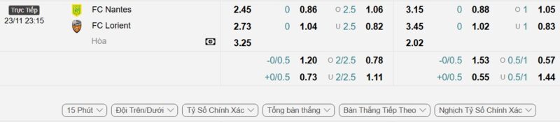- Kèo tỷ số bóng đá hiệp 1: Nantes 0-2 Lorient