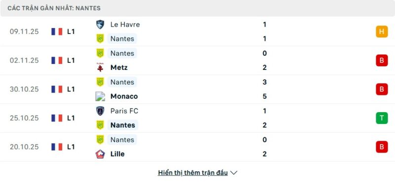 Thống kê phong độ gần đây Nantes vs Lorient
