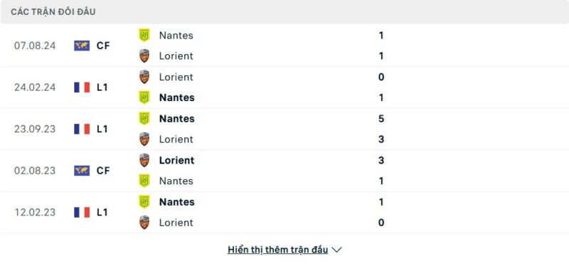 Thành tích đối đầu của Nantes vs Lorient