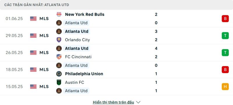 5 trận gần nhất của Atlanta United: L-W-W-L-D