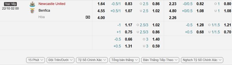 Bảng Tỷ lệ kèo bóng đá Newcastle United vs Benfica