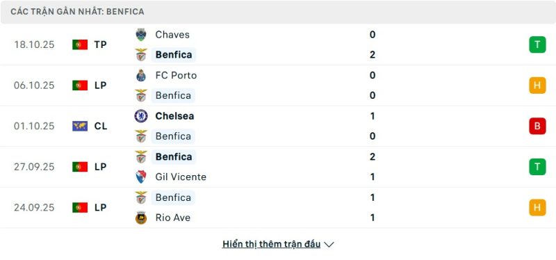 5 trận gần nhất của Benfica: W-D-L-W-D