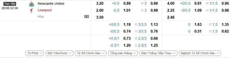 Bảng Tỷ lệ kèo bóng đá Newcastle United vs Liverpool