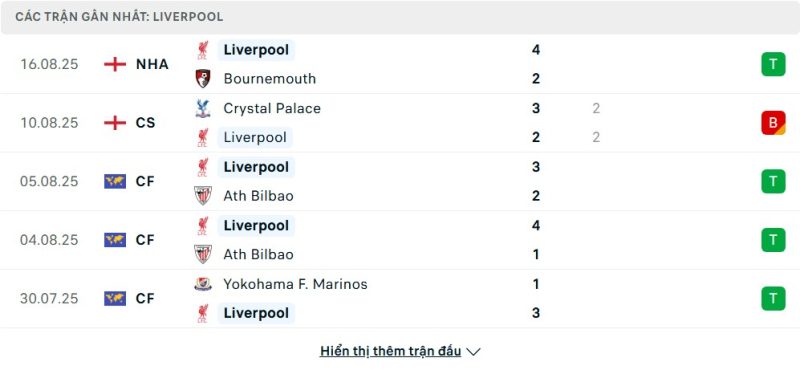 5 trận gần nhất của Liverpool: W-D-W-W-W