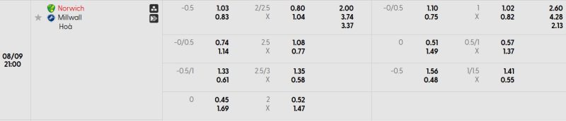 Bảng Tỷ lệ kèo bóng đá Norwich City vs Millwall