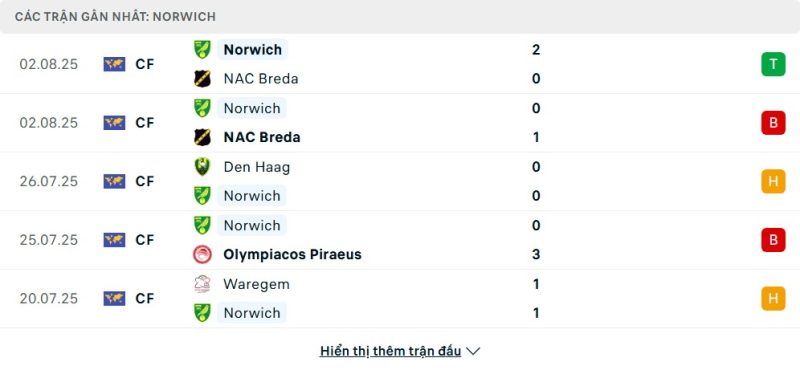 5 trận gần nhất của Norwich City: W-L-D-L-D