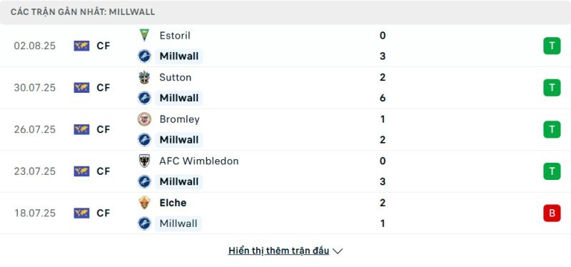 Bên kia chiến tuyến, Millwall bước vào mùa giải 2025/26 với phong độ giao hữu ấn tượng. Họ thắng 5/7 trận gần nhất, trong đó có chiến thắng 3-0 trước Estoril, 6-2 trước Sutton và 2-1 trước Bromley. Hàng công của Millwall thi đấu hiệu quả với khả năng tận dụng cơ hội tốt, nhưng hàng thủ đôi lúc vẫn mắc sai sót, điển hình là trận thua 1-2 trước Elche. Kết thúc mùa trước, Millwall xếp ở nhóm giữa bảng xếp hạng nhưng thể hiện sự khó chịu khi đối đầu với các đối thủ mạnh, trong đó từng thắng Norwich 3-1.