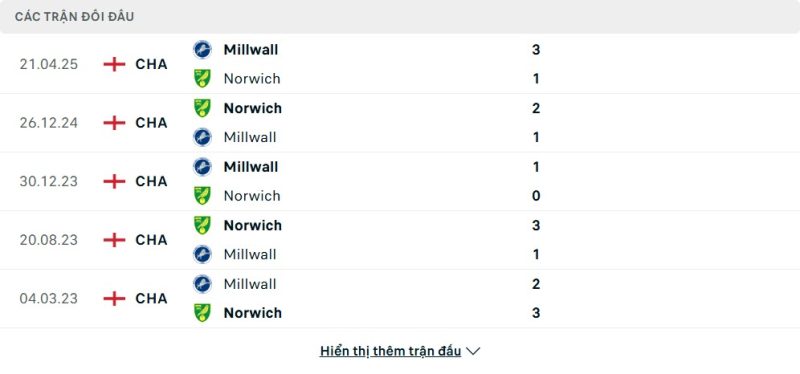 Thành tích đối đầu của Norwich City vs Millwall