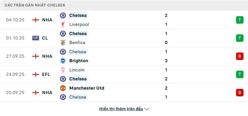 5 trận gần nhất của Chelsea: W-W-L-W-L