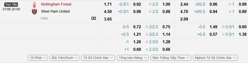 Bảng Tỷ lệ kèo bóng đá Nottingham Forest vs West Ham United