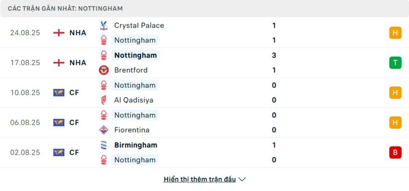 Thống kê phong độ gần đây Nottingham Forest vs West Ham United