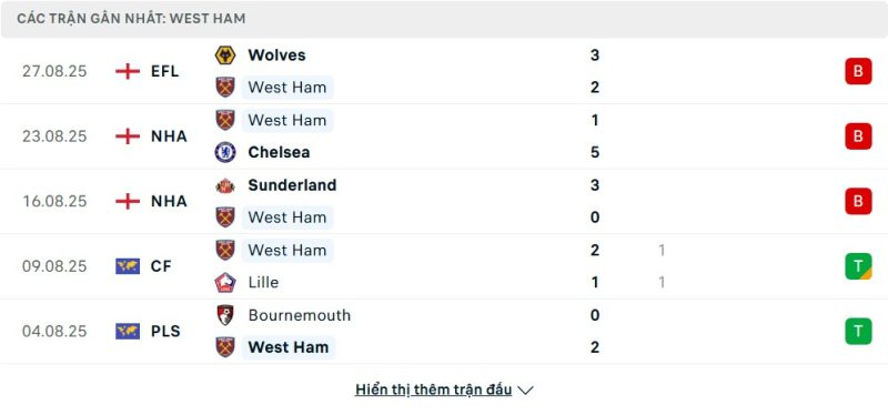 5 trận gần nhất của West Ham United: L-L-L-D-W