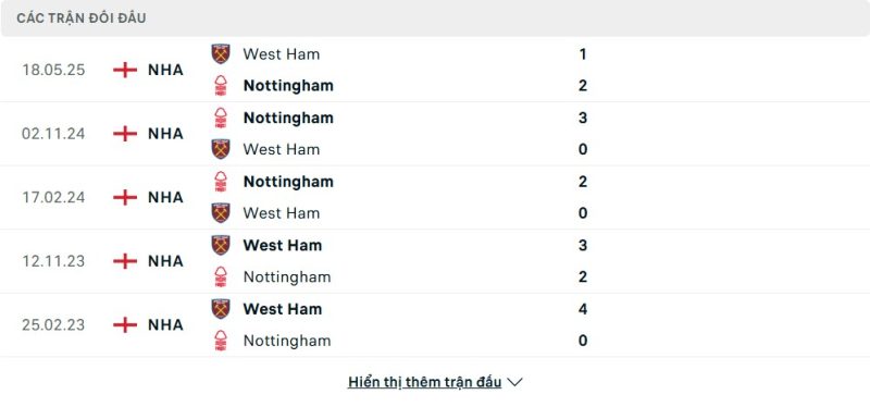Thành tích đối đầu của Nottingham Forest vs West Ham United