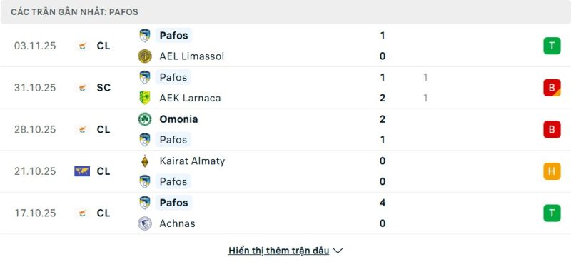 5 trận gần nhất của Pafos: W-D-L-D-W