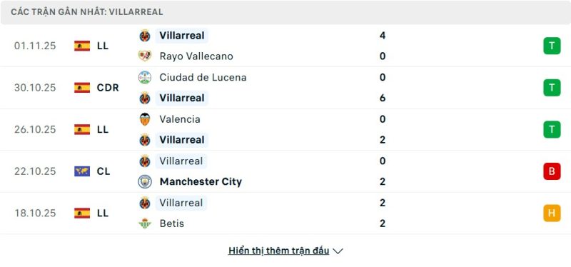 5 trận gần nhất của Villarreal: W-W-W-L-D