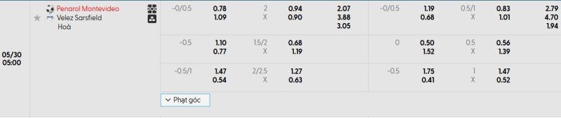 Bảng Tỷ lệ kèo bóng đá Peñarol vs Vélez Sarsfield