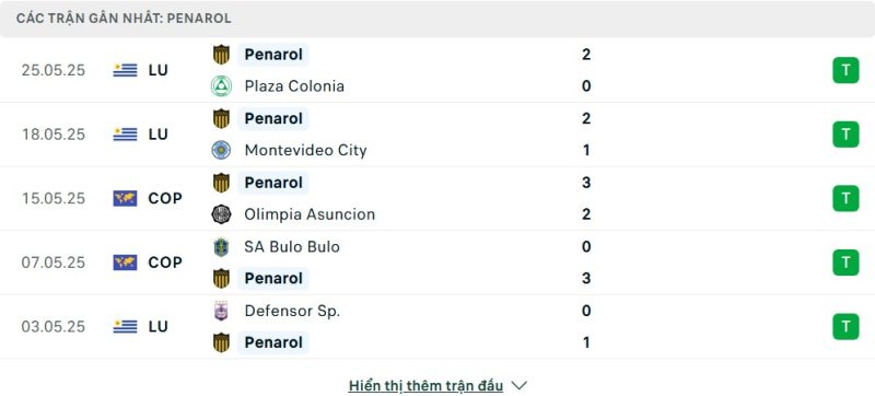 5 trận gần nhất của Peñarol: W-W-W-W-W