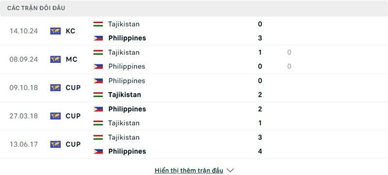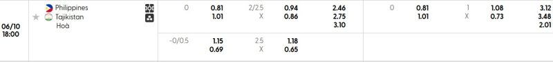Bảng Tỷ lệ kèo bóng đá Philippines vs Tajikistan