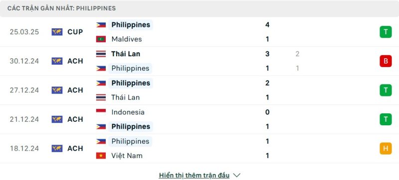 5 trận gần nhất của Philippines: W-L-W-W-D