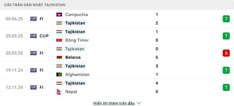 5 trận gần nhất của Tajikistan: W-W-L-W-W