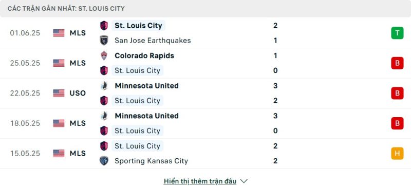 5 trận gần nhất của St.Louis City: W-L-L-L-D