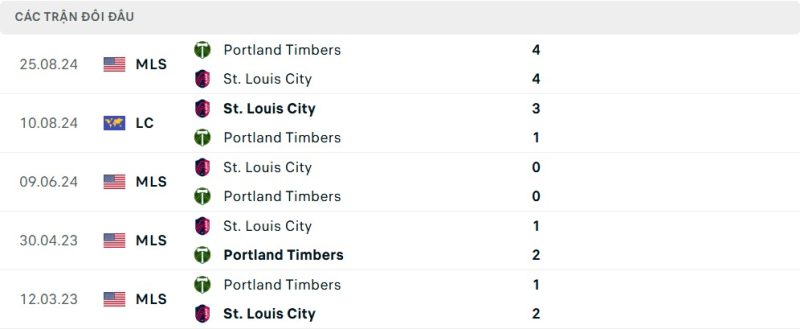 Thành tích đối đầu của Portland Timbers vs St.Louis City
