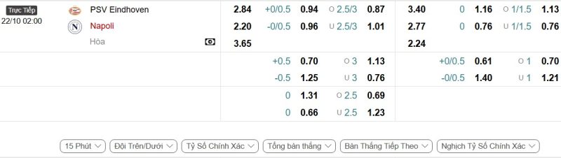 - Kèo tỷ số bóng đá hiệp 1: PSV Eindhoven 1-0 Napoli