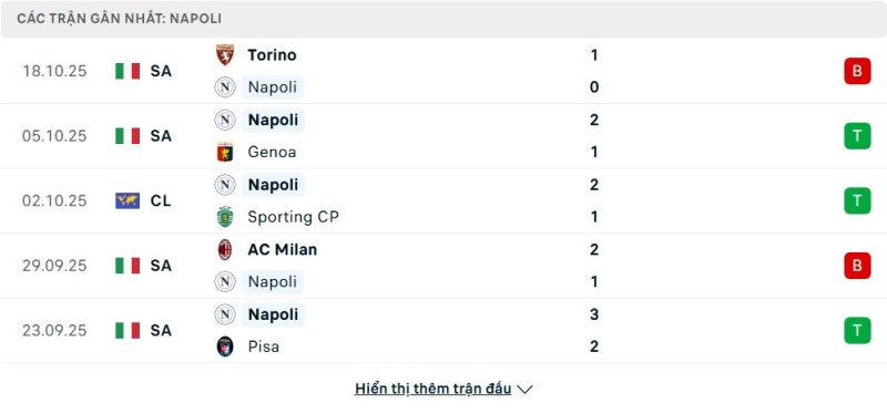 5 trận gần nhất của Napoli: L-W-W-L-W