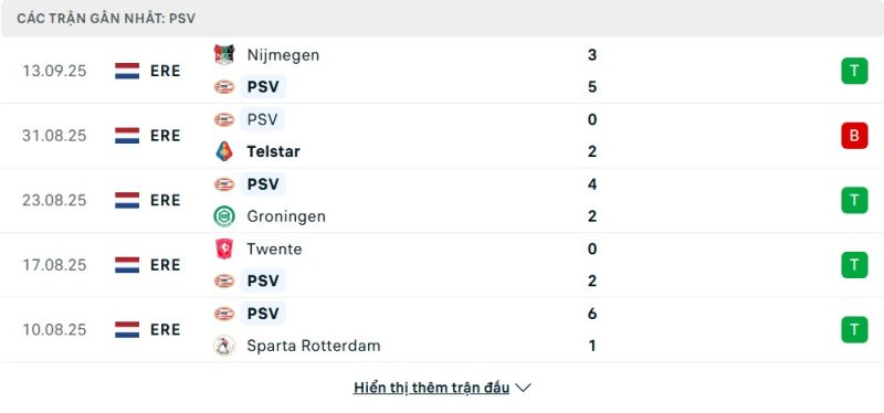 5 trận gần nhất của PSV Eindhoven: W-L-W-W-W