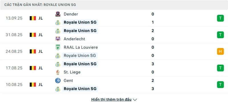 5 trận gần nhất của Union Saint-Gilloise: W-W-D-W-W