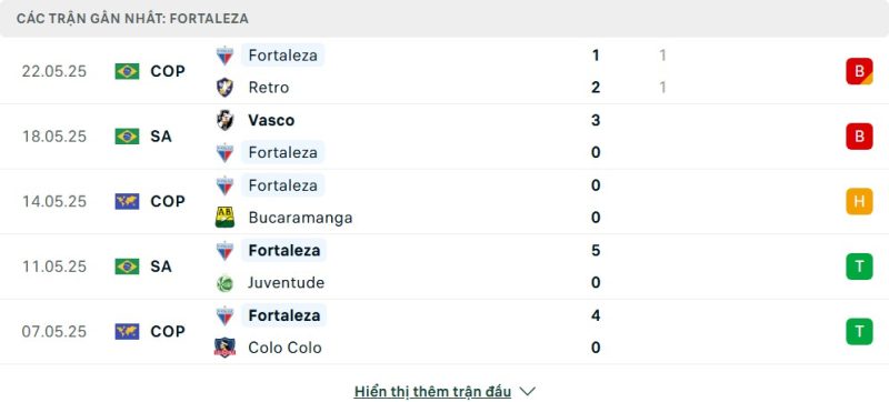 5 trận gần nhất của Fortaleza: D-L-D-W-W