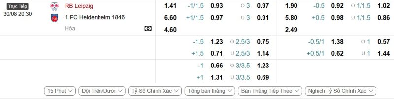 Bảng Tỷ lệ kèo bóng đá RB Leipzig vs Heidenheim