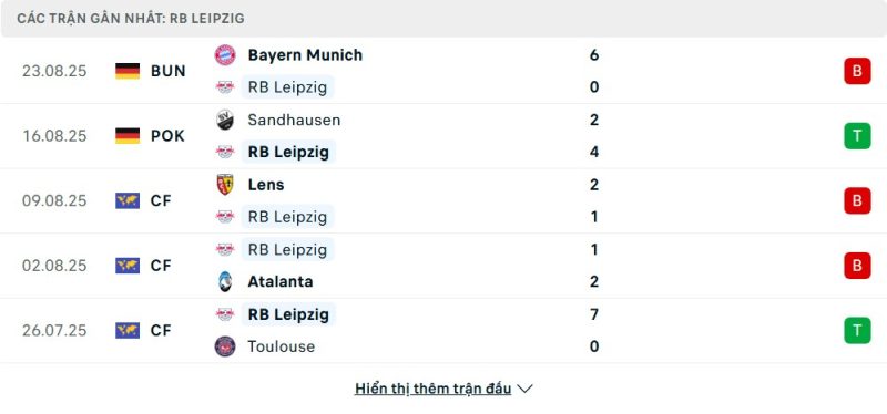 5 trận gần nhất của RB Leipzig: L-W-L-L-W