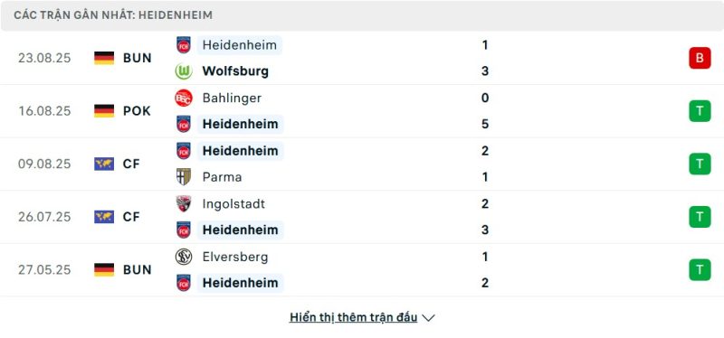 5 trận gần nhất của Heidenheim: L-W-W-W-W