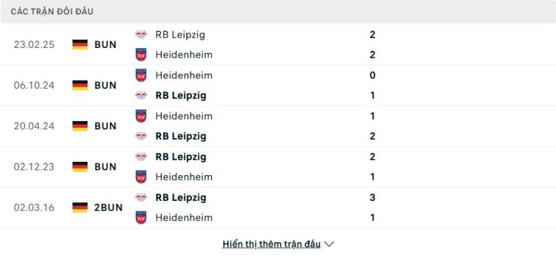 Thành tích đối đầu của RB Leipzig vs Heidenheim